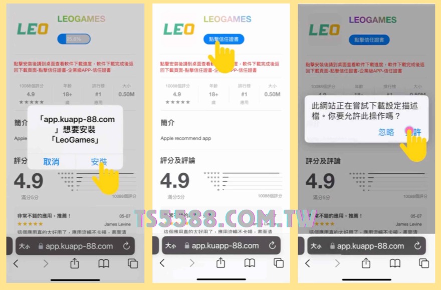 3.當出現安裝提示時,選擇「安裝」,之後按「信任證書」,並下載設定描述檔,選擇「允許」。