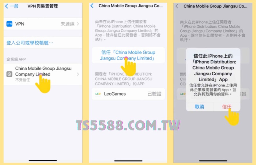 4.畫面會跳轉至VPN與裝置管理,點擊「信任」,即完成安裝。