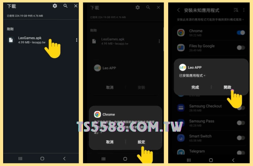 3.系統會提示您的手機目前無法安裝此來源提供的不明應用程式。請點擊「設定」進行變更。