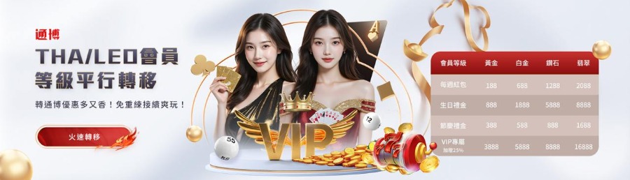 即日起至2024/12/31,THA & LEO 會員加入通博,單筆儲值該層級所需金額(以上),隔日即可獲得娛樂城跳槽金。每個帳號可領取一次。