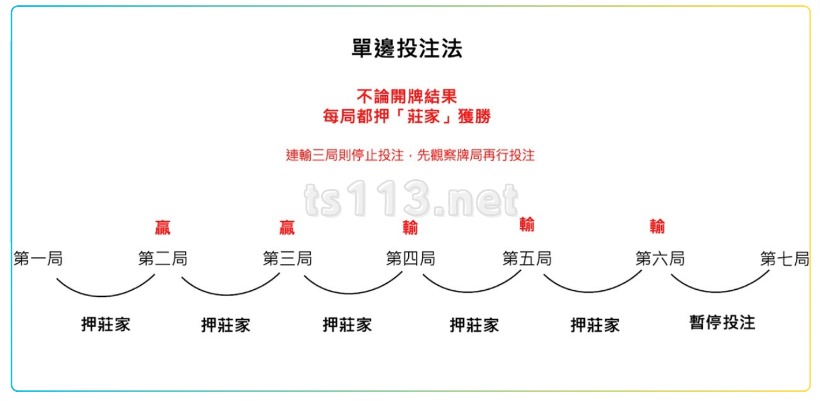 單邊投注法其實很簡單,就是只選擇下注在莊家或閒家其中一方。當你選定了莊家或閒家後,就一直押注那一方,直到連續輸了三局才暫停下注。這時,你需要停止下注,等到選擇的一方再度獲勝後,才繼續押注。