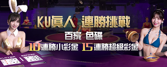 1.玩家於【KU真人】百家類遊戲中不需另外投注,只要投注內容含有【莊】或【閒】方位,當輸贏結果連續贏10局即為過關成功,可獲得額外【小彩金】;過關15局,可獲得額外【超級彩金】。