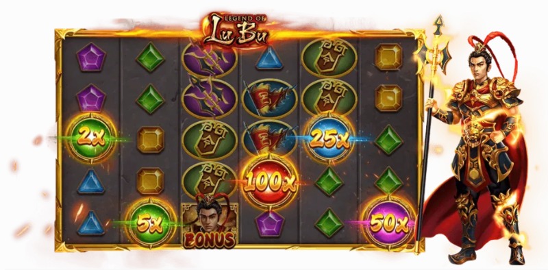 在戰神呂布中,當出現「8個以上相同符號」時,這些符號將被消除,而不受特定賠付線的限制。符號在掉落後的位置是隨機的,如果再次出現8個以上相同符號,則可以連續消除,增加連勝的機會。